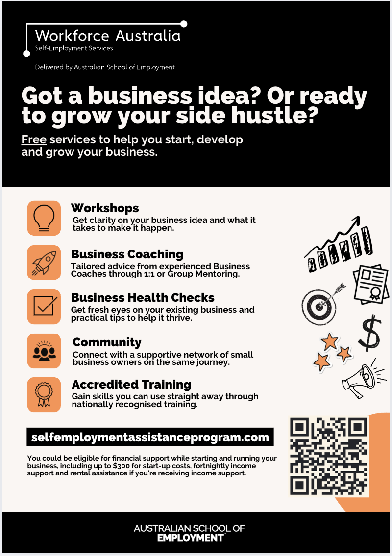 Pumicestone Chamber of Commerce is proud to share this incredible opportunity from The Australian School of Employment: the Self-Employment Assistance Program — a fully funded initiative by Workforce Australia and the Department of Employment & Workplace Relations.